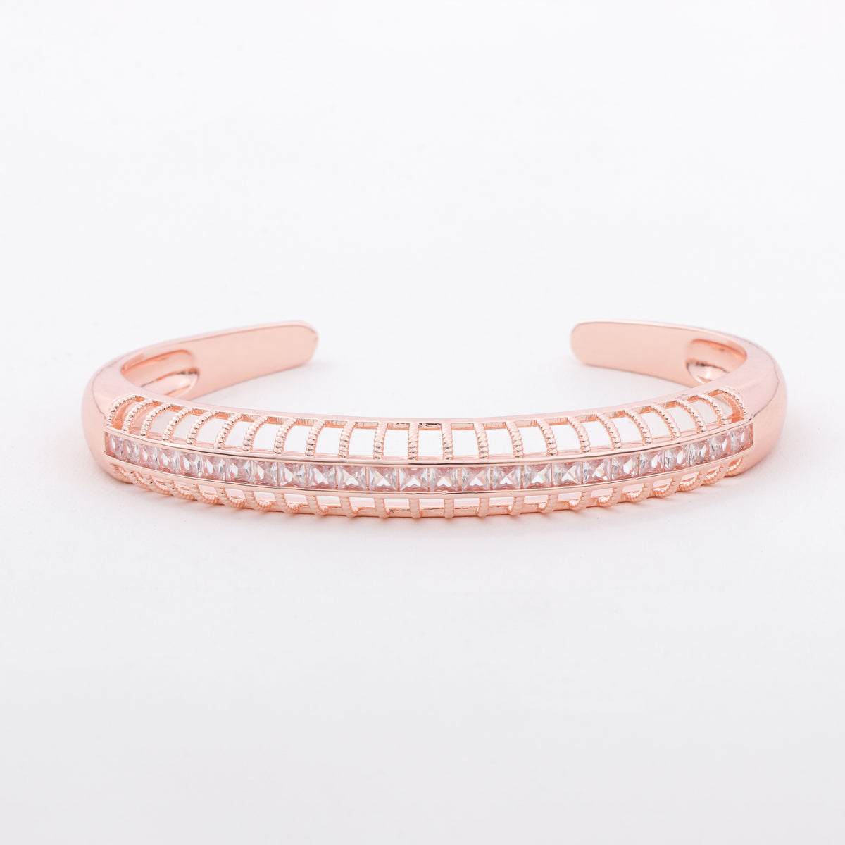Elevate your elegance with the CAELII's Radiant Rose Gold Cuff, a stunning anti-tarnish bracelet crafted in a luxurious rose gold finish. Adorned with a row of shimmering princess-cut stones and intricate cut-out detailing, this open cuff blends modern charm with timeless sophistication—perfect for day-to-night glamour.